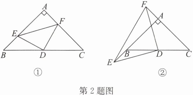 (2)如图②,若$E$,$F分别为AB$,$CA$延长线上的点,仍有$BE= AF$,其他条件不变,那么$\triangle DEF$是否仍为等腰直角三角形? 证明你的结论.