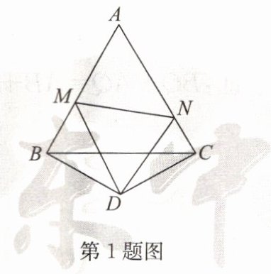 1. 如图,$△ABC$是边长为 4 的等边三角形,$BD= CD$,且$∠BDC= 120^{\circ }$,以 D 为顶点作一个$60^{\circ }$角,使其两边分别交 AB 于点 M,交 AC 于点 N,连接 MN,则$△AMN$的周长是____.