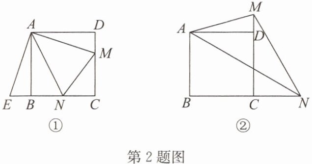 2. 如图①,四边形 ABCD 是正方形,点 M,N 分别在边 CD,BC 上,且$∠MAN= 45^{\circ }$,我们把这种模型称为“半角模型”. 在解决“半角模型”问题时,旋转是一种常用的方法,如图①,将$△ADM$绕点 A 顺时针旋转$90^{\circ }$,点 D 与点 B 重合,得到$△ABE$.