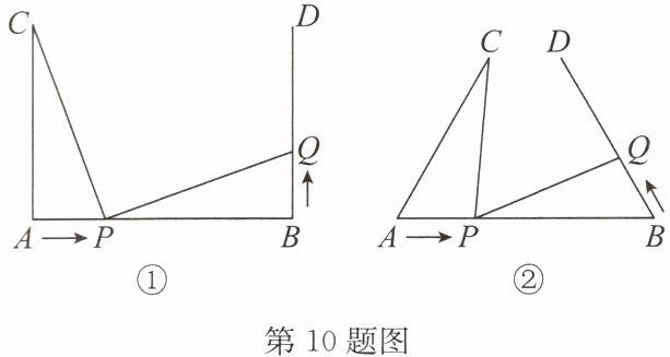 10.如图①,$AB= 4cm,AC⊥AB,BD⊥AB,AC= BD= 3cm$.点 P 在线段 AB 上以 1 cm/s 的速度由点 A 向点 B 运动,同时,点 Q 在线段 BD 上由点 B 向点 D 运动.它们运动的时间为 t s.