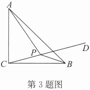 3. 如图,△ABC 为等腰直角三角形,AC = BC = 4,∠BCD = 15°,P 为射线 CD 上的动点,求|PA - PB|的最大值。