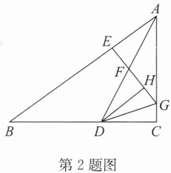 2. 如图,在$△ABC$中,$D为边BC$上一点,$E为边BA$上一点,且$AE= CD$,连接$AD$,$F为AD$的中点,连接$EF$并延长,交$AC于点G$,在$FG上取点H$,使$FH= FE$,连接$GD$。若$HG= CG$,求证: