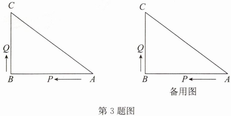 3. 如图,在$\triangle ABC$中,$∠B= 90^{\circ}$,$AB= 16cm$,$BC= 12cm$,P,Q 是$\triangle ABC$边上的两个动点,其中点 P 从点 A 开始沿$A→B$方向运动,速度为$1cm/s$,点 Q 从点 B 开始沿$B→C→A$方向运动,速度为$2cm/s$,它们同时出发,设运动的时间为$t s$。