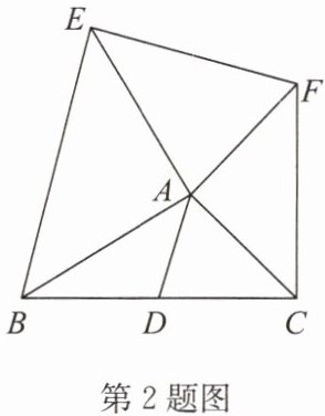 2. 如图,AD是△ABC的中线,AB= AE,AC= AF,∠BAE= ∠CAF= 90°,试判断线段AD与EF的数量关系,并加以证明。
