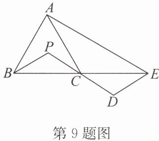 9. 如图, $ P 为等边 \triangle A B C $内一点, 连接$ B P, P C $, 延长$ P C 到点 D $, 使$ C D= P C $. 延长$ B C 到点 E $, 使$ C E= B C $, 连接$ A E, D E $.