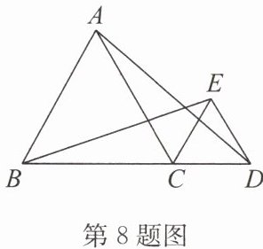 8. (2024·响水县月考)如图, $ D 是等边三角形 A B C 的边 B C $延长线上的一点, $ \angle E B C= \angle D A C, C E // A B $. 求证:$ \triangle C D E $是等边三角形.