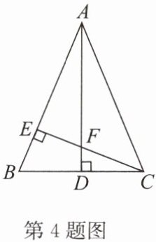 4. 如图,在$\triangle ABC$中,$AB = AC$,$AD\perp BC$,垂足为$D$,$CE\perp AB$,垂足为$E$,$AE = CE$. 求证:(1)$\triangle AEF\cong \triangle CEB$;(2)$AF = 2CD$.