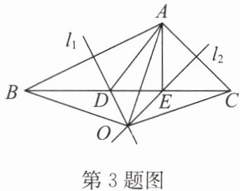 3. 如图,在△ABC中,AB边的垂直平分线$l_1$交BC于点D,AC边的垂直平分线$l_2$交BC于点$E,l_1$与$l_2$相交于点O。若∠ACB= 45°,DE= 3,BD= CE+1。