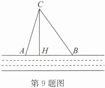 9.如图,在一条东西走向的河一侧有一村庄C,河边原有两个取水点A,B,其中$AB= AC$,由于某种原因,由C到A的路现在已经不通,C村为方便村民取水,决定在河边新建一个取水点H(点A,H,B在一条直线上),并新修一条路CH,测得$CB= 3$千米,$CH= 2.4$千米,$HB= 1.8$千米.