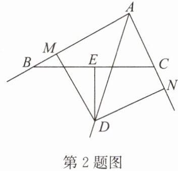 2. 如图,在△ABC中,∠CAB的平分线AD与BC的垂直平分线DE交于点D,DM⊥AB于点M,DN⊥AC,交AC的延长线于点N。