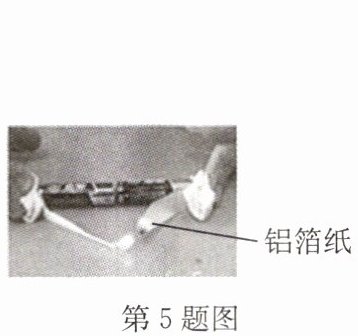 5. 如图所示是小明的物理老师在课堂上演示的一个实验。把一张细条状的铝箔纸两端分别压在干电池的正负极上,不一会儿,铝箔纸就燃烧了起来。这是由于电源发生了