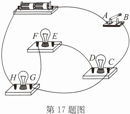17. 如图所示电路,在某些接线柱间去掉或添加一根导线,可使三盏灯泡分别成为串联或并联.