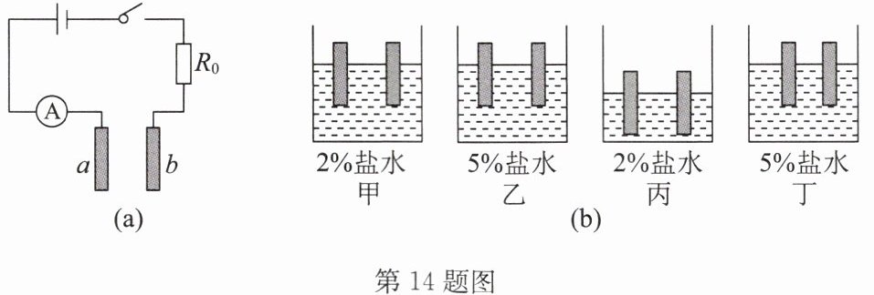 14. 某物理兴趣小组学习了导体电阻的知识后,对食盐水溶液的导电性能与什么因素有关提出了以下猜想: