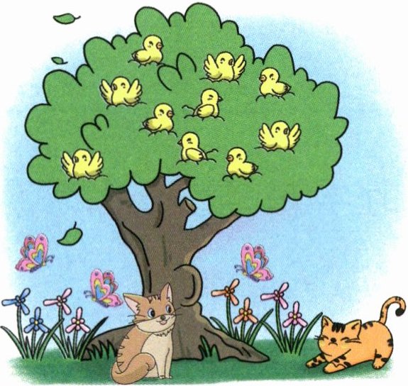 tú kē duǒ 图 中 有 □ 棵 大 树,大 树 上 有 □ 只 小 鸟,树 下 有 □ 朵 花,花 hú dié wǔ 间 有 □ 只 蝴 蝶 在 飞 舞。