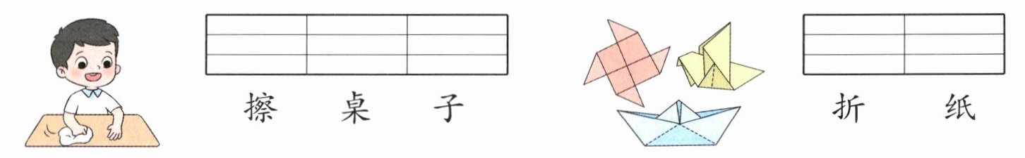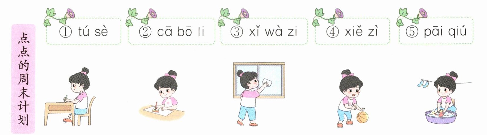 ① tú sè ② cā bō li ③ xǐ wà zi ④ xiě zì ⑤ pāi qiú