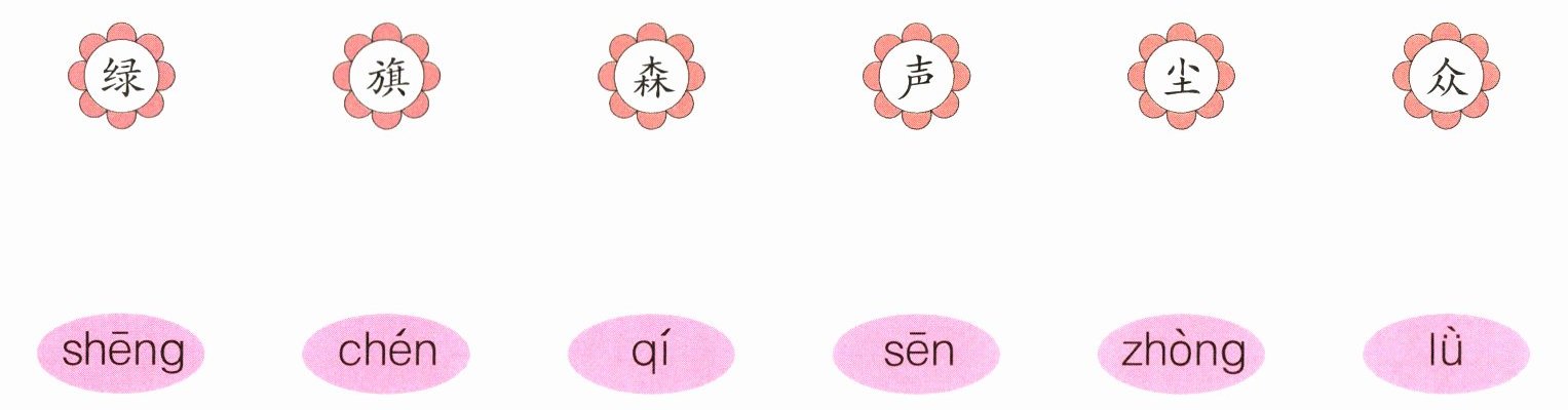 绿——lǜ 旗——qí 森——sēn 声——shēng 尘——chén 众——zhòng