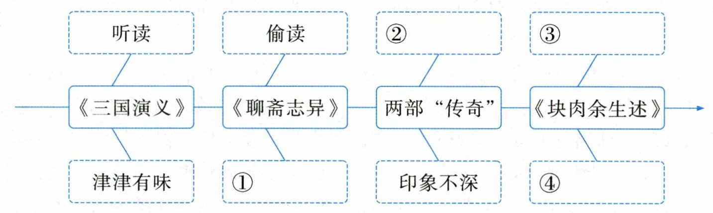 1. 百无聊赖 走火入魔 跌宕起伏 饥寒交迫 2. ① 入迷 ② 比较着读 ③ 反复地读 ④ 感动 读书方法 读书感受 3. 表现了“我”被书中的故事情节感动而“流泪”,联想到自己的幸福,没法用语言表达,只好用“掰”“塞”面包来表达幸福感的天真幼稚的心理。 4. B 5. 示例:反复地读 正所谓“旧书不厌百回读,熟读深思子自知”,我第一次读《三国演义》时,并不能完全明白它讲了什么,后来我反复地读,就越读越明白了