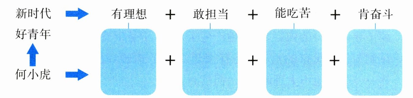5. 新思维 逻辑梳理 党的二十大报告指出,“青年强,则国家强”,对广大青年提出了“立志做有理想、敢担当、能吃苦、肯奋斗的新时代好青年”的重要要求。你认为何小虎是新时代好青年吗? 请根据提示填一填。(4分)
