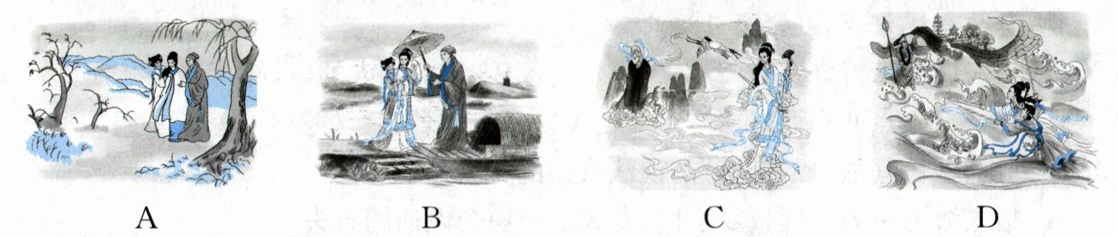 1. B 2. 董永与仙女结为夫妻 仙女答应织布要求 仙女完成要求 仙女表明身份,凌空而去 3.