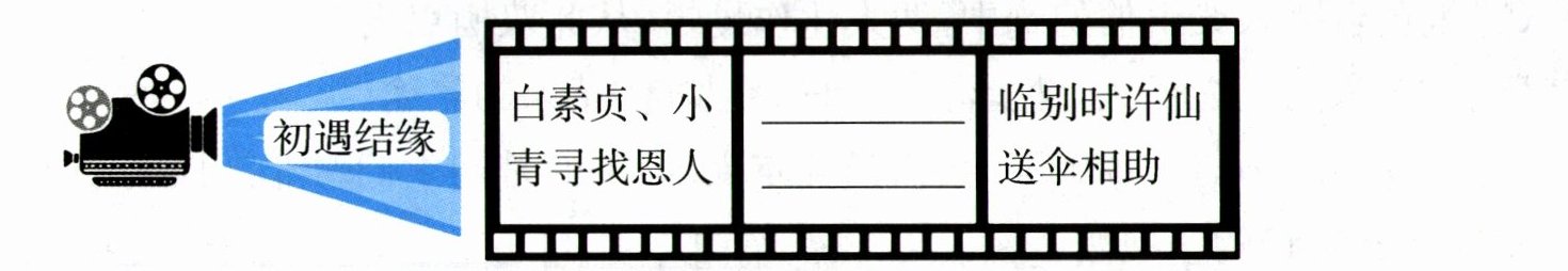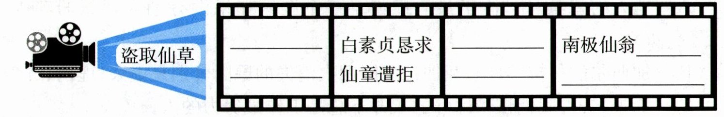 1. B C 2. (示例)初遇结缘:施计同船避雨 盗取仙草:许仙昏死,白素贞摘仙草下山被阻 白素贞与二仙打斗摔倒 感动赠灵芝 3. B 4. C 5. 示例:白素贞历经艰险终于拿到了灵芝仙草,喜极而泣。她小心翼翼地收起灵芝,立马驾云赶往家中,生怕误了时辰,再也无法救回许仙。