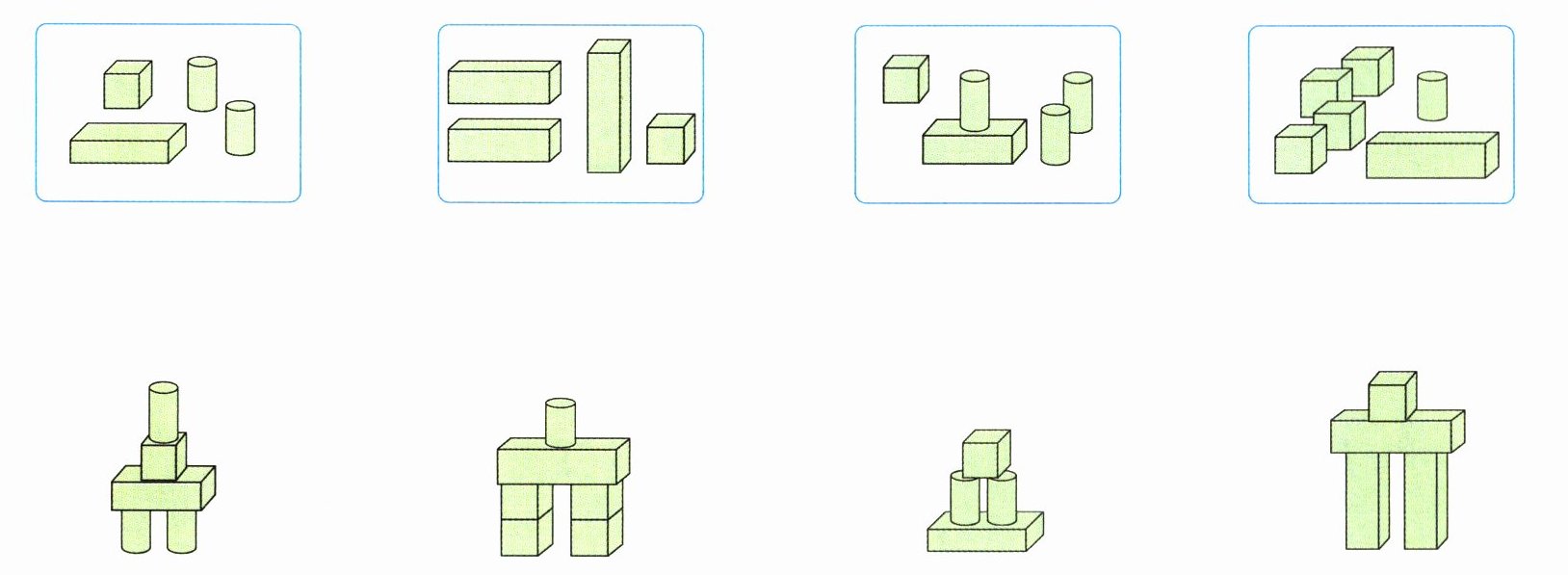 上面一行每组中的积木可以拼成下面一行哪个物体?
