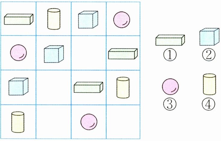 (从上往下,从左往右) ④ ③ ① ② [解析:观察每一横行或每一竖行都由行都由三00组成。先从上往下数,第二横行中已有Q二这三个物体,缺少的是;第三横行中已有这三个物体,缺少的是Q;再从左往右数,第二竖行已有Q这三个物体,缺少的是;第四竖行已有Q三这三个物体,缺少的是。]
