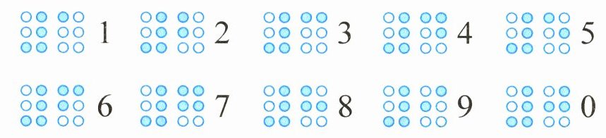 2. 亮点原创 在盲文中,使用每个阿拉伯数字,前面必须加上数字符号,国际上通用的阿拉伯数字符号是(3456点)。下面是1,2,3,4,5,6,7,8,9,0的盲文,若表示两位数就接着在后面加相应的符号,如:12的盲文是,17 的盲文是。那么盲文表示的数是( ),19用盲文表示是( )。(4分)