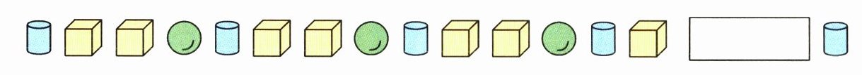 ”处的图形是“正方体、球、圆柱、正方体、正方体、球、圆柱、正方体、正方体、球”,数一数,一共有5个正方体、2个圆柱。]