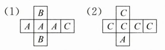 1. 在一个小正方体的六个面上分别写上“A”“B”或“C”,怎样写才可能达到下面的要求?在下面的图上写一写。