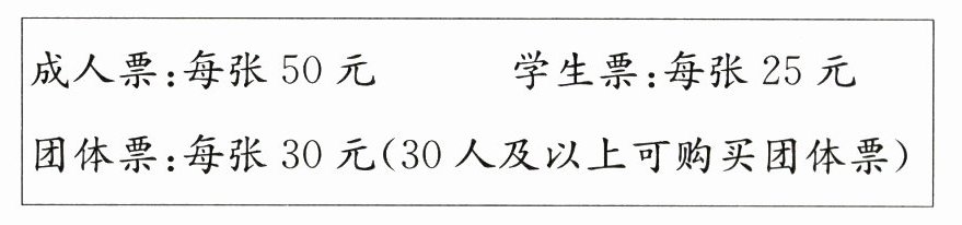 5. (2024·泰州泰兴市期末)“六一”儿童节,育才小学有 13 位教师和 96 名学生一起去游览湿地公园,景区售票处的价格如下图。请你设计出最省钱的购票方案,并算出购票一共需要多少元。(5 分)