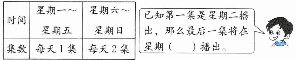 第一集在星期二播出,按照播放顺序,从星期二到星期五每天播放$1$集,星期六和星期日每天播放$2$集,以此规律循环。