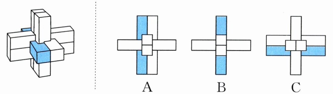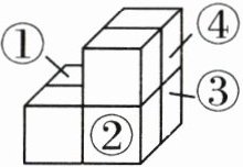 4. 亮点原创 如图,将这个物体中的一个正方体涂成蓝色,然后让甲、乙、丙三人分别从前面、右面和上面观察这个物体。若只有甲看不到蓝色正方体,则这个正方体在位置(