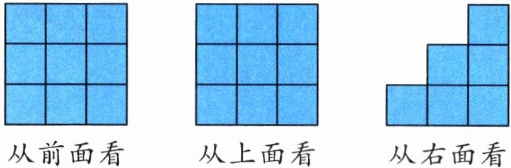 2. 新情境 真实生活 百货商场的仓库里堆放了一些正方体形状的沙发矮凳,经理准备将它们摆放在商场扶梯附近,供客人休息。这家商场一共有4部扶梯,每部扶梯旁要放4个沙发矮凳。下面三幅图是仓库管理员分别从这些沙发矮凳的前面、上面和右面观察到的样子。这些沙发矮凳够用吗? (6分)