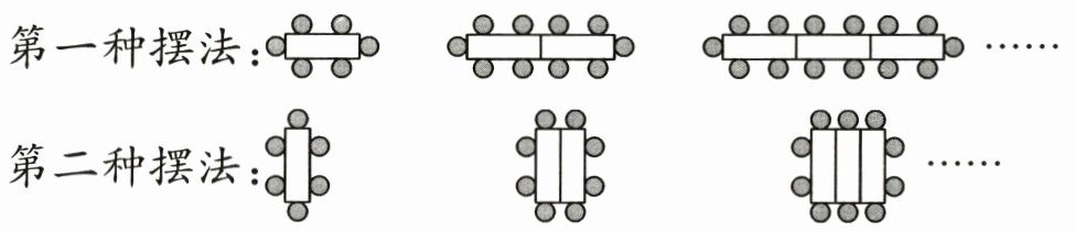 1. (2025·武汉江汉区期末)长街宴是哈尼族人民的一种传统习俗,生动体现了哈尼族同胞团结友善的传统,集中展示了多元的民族文化特色。如果一张桌子可坐6人,有以下两种摆放方式。
