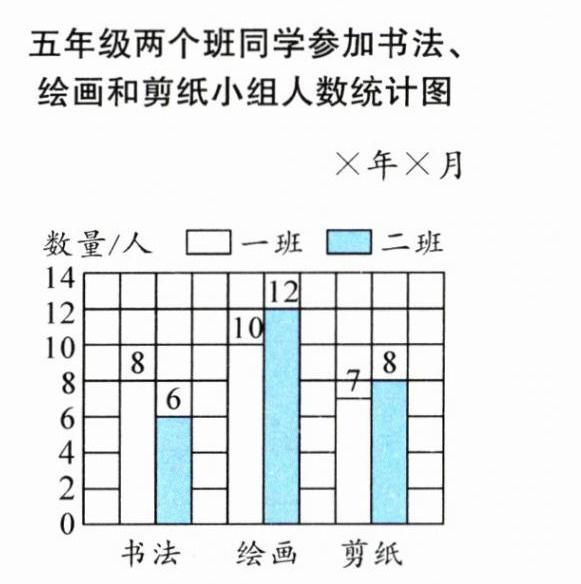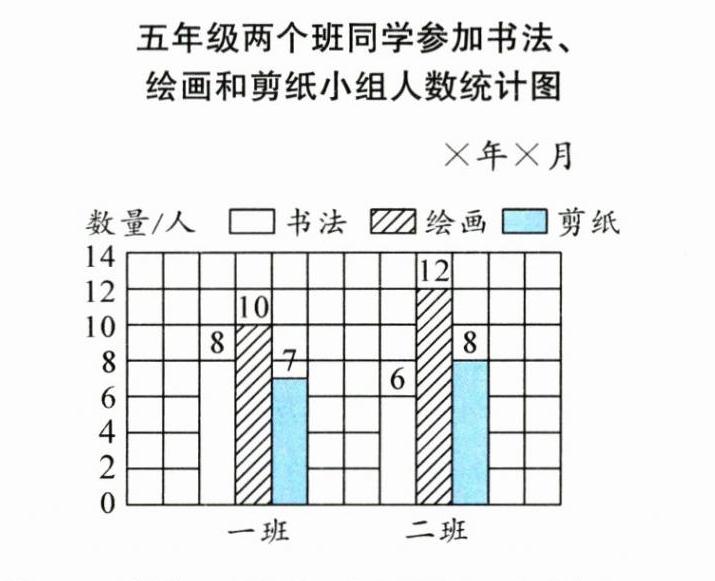 4. 某小学五年级开展实践活动,亮亮调查了其中两个班的同学参加书法、绘画和剪纸三个小组的人数情况,统计情况如下表。