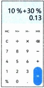 11. 新趋势 图表信息 小明在使用手机计算器计算时,竟然出现了“错误”(如图)。经过研究,他发现,原来手机计算器程序中把“$10\%+30\%$”算成“$10\%加上它的30\%$”。按照这样的程序,如果输入“$30\%+20\%$”,手机显示结果为(