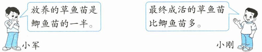 7. $(200×\frac{3}{5}-20)÷200=\frac{1}{2}$ 小军的表述正确。 最终成活的鲫鱼苗:$200×70\%=140$(尾) 最终成活的草鱼苗:$(200×\frac{3}{5}-20)×90\%=90$(尾) $140>90$ 小刚的表述不正确。