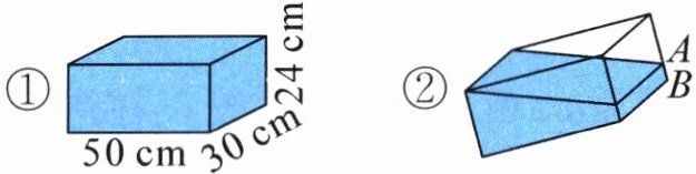 6. (2024·北京大兴区期末)在一个从里面量长 50 厘米、宽 30厘米、高 24 厘米的长方体容器中装满水,平放在桌子上(如图①)。现在把它斜放(如图②),水倒出$\frac {3}{8}$,这时AB的长度是(