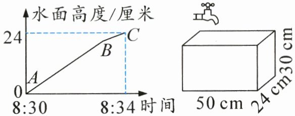(2)8 时 33 分 - 8 时 30 分=3 分 $8.4×3=25.2$(立方分米) 25.2 立方分米=25200 立方厘米 $25200÷(50×24)=21$(厘米)