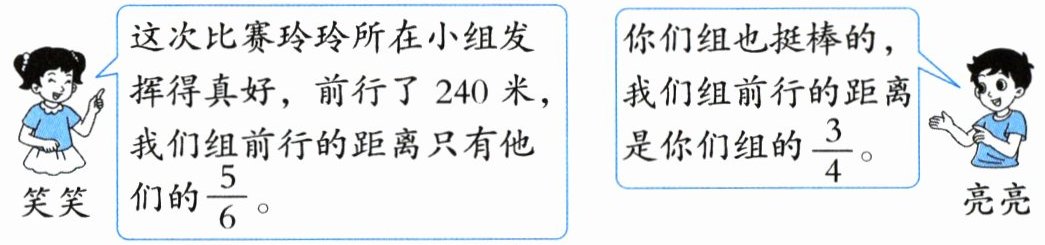 笑笑组:$240×\frac{5}{6}=200$(米) 亮亮组:$200×\frac{3}{4}=150$(米)