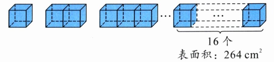 24 [解析:假设每个小正方体的底面积为a cm²,则一个小正方体的表面积是6a cm²;两个小正方体拼在一起时,上面、下面、前面和后面各有2个面露在外面,左右各有1个面露在外面,所以表面积为(2×4+2)×a=10a cm²;三个小正方体拼在一起时,上面、下面、前面和后面各有3个面露在外面,左右各有1个面露在外面,所以表面积为(3×4+2)×a=14a cm²……寻找规律,可知当有16个小正方体拼在一起时,表面积为(16×4+2)×a=66a cm²。因为这个图形的表面积为264 cm²,所以a=264÷66=4,因此一个小正方体的表面积是4×6=24(cm²)。]