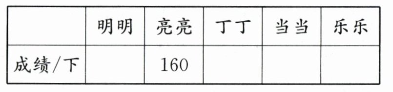 7. 五名同学进行1分钟跳绳比赛,明明跳的下数是亮亮的$\frac {15}{16}$,是丁丁的$\frac {5}{6}$;丁丁跳的下数是当当的$\frac {4}{3}$,是乐乐的$\frac {9}{7}$。他们分别跳了多少下?填在下面的表格中。