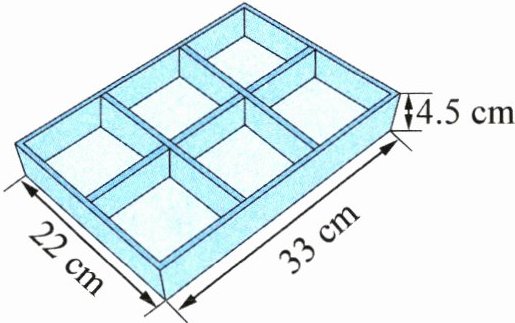 5. 桂花糕已有300多年历史,是用糯米粉、糖和桂花蜜为原料制作而成的中国特色小吃。如图是一个制作桂花糕的六格木质模具,如果底部及每个小格四周木板厚0.5厘米,那么这个模具的容积是多少毫升? (6分)