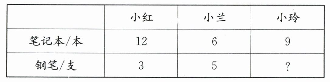 7. 新趋势 图表信息 小红、小兰、小玲三人都买了笔记本和钢笔,她们用去的钱一样多。