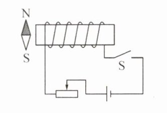 【解析】由安培定则可知,右手握住螺线管,四指指向电流的方向,大拇指指向左端,则通电螺线管的左端为N极;根据同名磁极相互排斥,异名磁极相互吸引可知,小磁针的S极应靠近螺线管的左端,则小磁针的N极指向左;滑动变阻器的滑片向左移动时,连入电路的电阻减小,电流增大,螺线管的磁性增强。