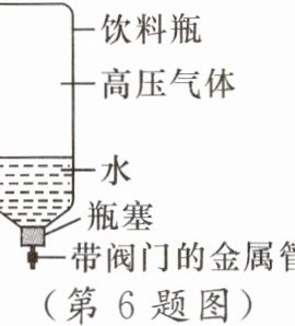 6. (多选)小明用饮料瓶制作水火箭,先在瓶里装适量水,然后将带有阀门的金属管插入瓶塞,旋紧瓶塞后用打气筒往瓶里打足气(如图);打开阀门后,水从尾部的金属管向下喷出,水火箭竖直向上飞向空中。下列分析正确的是(