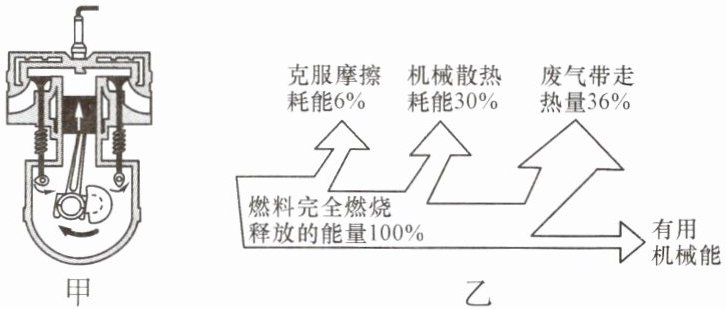 10. (多选)汽车是现代生活中最常见的一种交通工具。如图甲、乙所示分别是某单缸四冲程汽油机的某冲程及能量流向图。下列有关说法正确的是(