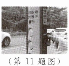 11. 物理学与日常生活如图所示是城市交通路口一种“按钮式红绿灯”。当路面上车辆不多时,行人自己可以按下路边的控制按钮,这时车辆行驶的方向红灯会亮起,同时行人要行进的方向绿灯也会亮起,行人就可以安全地通过路面,红灯和绿灯之间是