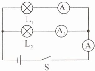 【典例】如图所示,在“探究并联电路的电流规律”时,闭合开关S后,电流表$A_{1}$的示数是0.1A,电流表$A_{2}$的示数是0.3A,则电流表A的示数是(