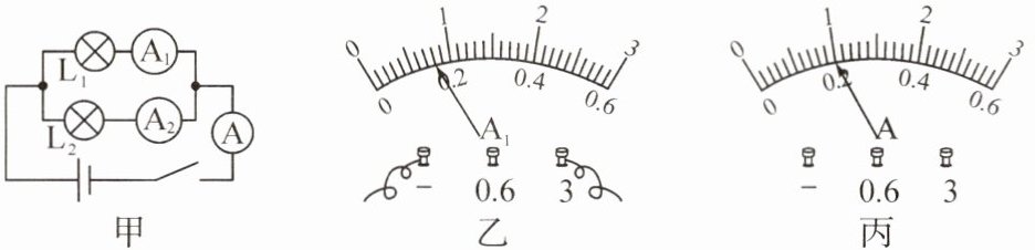 4. 在“探究并联电路中干路电流与各支路电流的关系”的实验中,小明按图甲所示电路图连接好电路后,闭合开关,电流表$A_{1}$的示数如图乙所示,电流表$A_{2}$和A的指针都指向同一刻度,如图丙所示,则$L_{1}$中的电流为